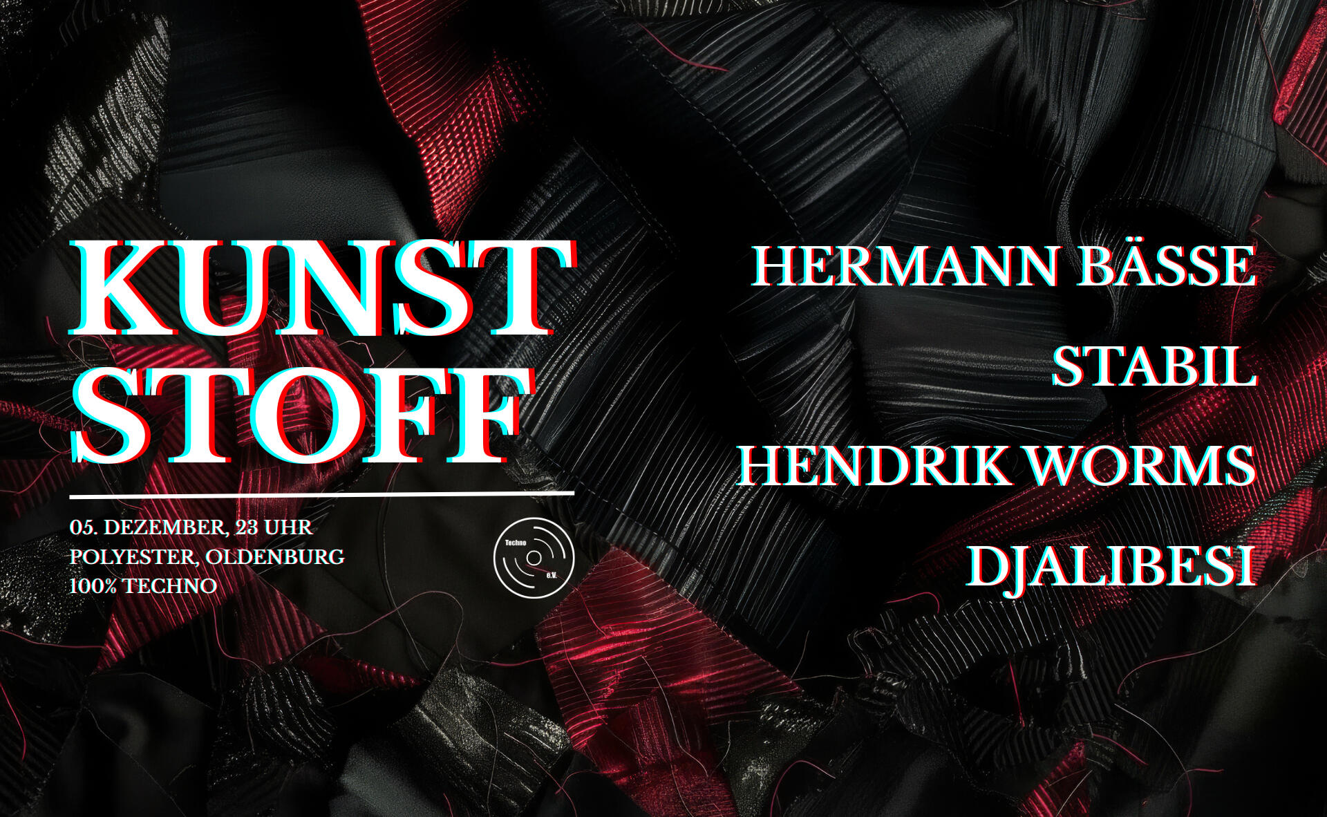 KUNSTSTOFF ist zurück!Bist du bereit für das letzte Techno e.V. Event des Jahres?Am 05. Dezember reißen wir im Polyester Klub in Oldenburg noch mal richtig ab!
